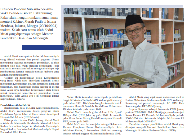 Presiden Prabowo Subianto bersama Wakil Presiden Gibran Rakabuming Raka telah mengumumkan nama-nama menteri Kabinet Merah Putih di Istana Merdeka, Jakarta, Minggu (20/10/2024) malam. Salah satu nama ialah Abdul Mu’ti yang dipercaya sebagai Menteri Pendidikan Dasar dan Menengah.